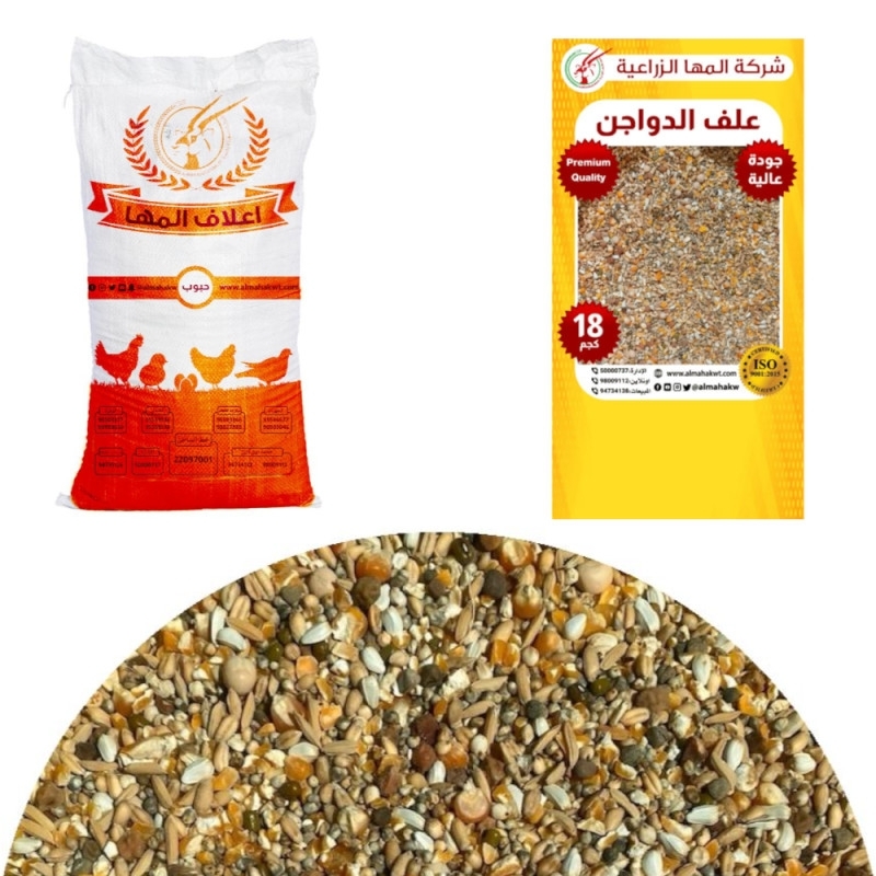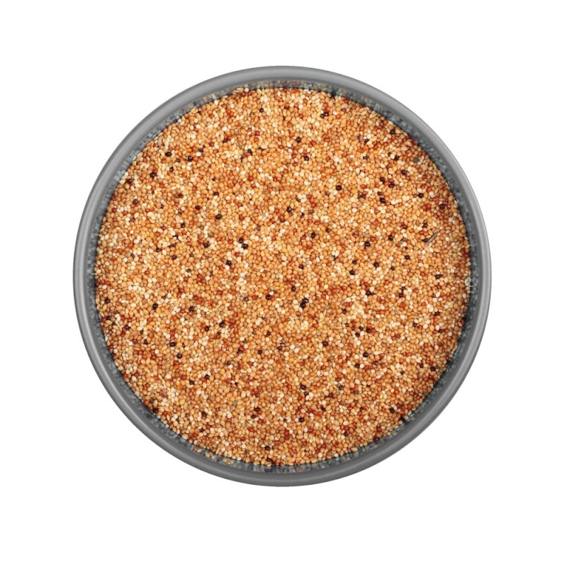 المكونات: بذور الدخن الأصفر، بذور الدخن الأبيض، بذور الدخن الأحمر، بذور الدخن الأسود، الخبز الملون، وبذور الطيور.