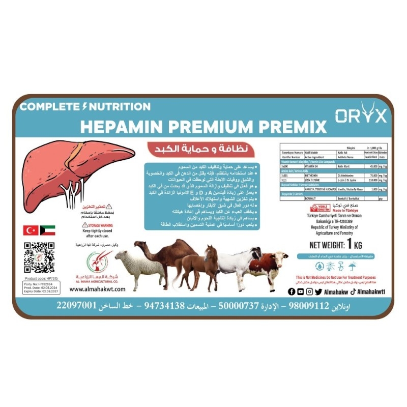 فوائد: يساعد على حماية الكبد وتطهيره من السموم عند استخدامه بانتظام، فإنه يقلل من دهون الكبد والخصوبة والشبق ووفيات الأجنة التي لوحظت في الحيوانات وهو فعال في تطهير وإزالة السموم التي قد تطرأ على الكبد فهو يزيد من فيتامين E، D، A والأمونيا الزائدة في الكبد يتم تخزين الشهية واستهلاك الأعلاف له دور فعال في شبق واخصاب الأبقار يخفف العبء على الكبد ويساهم في إعادة هيكلته يساهم في زيادة إنتاجية اللحوم والألبان ويلعب دوراً أساسياً في عملية التسمين واستقلاب الطاقة طريقة الاستخدام: امزجه في الماء أو العلف الوزن الصافي: 1 كجم