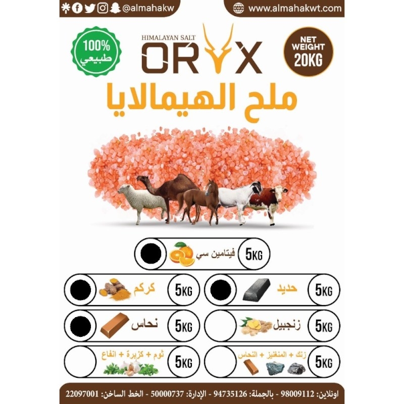 مثالي لـ الأبقار، الخيول، الأغنام، الإبل والماعز، هذا الملح الغني بالمعادن يساعد على الحفاظ على التغذية المثالية وأفضل أداء للحيوانات.